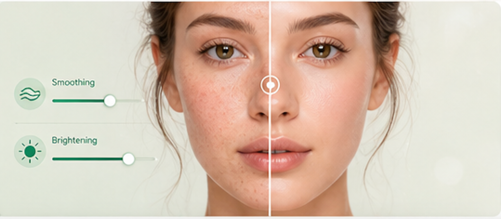 Set skin smoothing and brightening to your desired intensity. Start with the defaults for a natural look—push higher for a more polished finish.